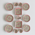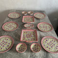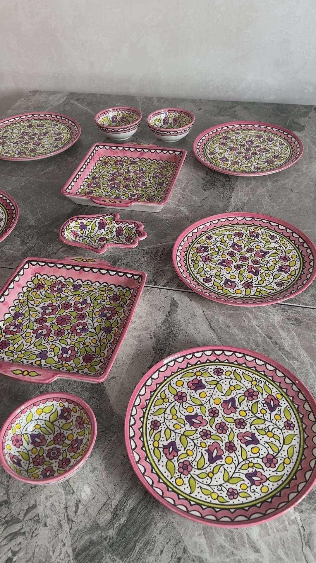 Bring a touch of authentic Palestinian artistry to your table with this fully handmade 13-piece ceramic set for six people. The set includes matching dining plates, serving plates, and bowls, each with a vibrant pink floral design.