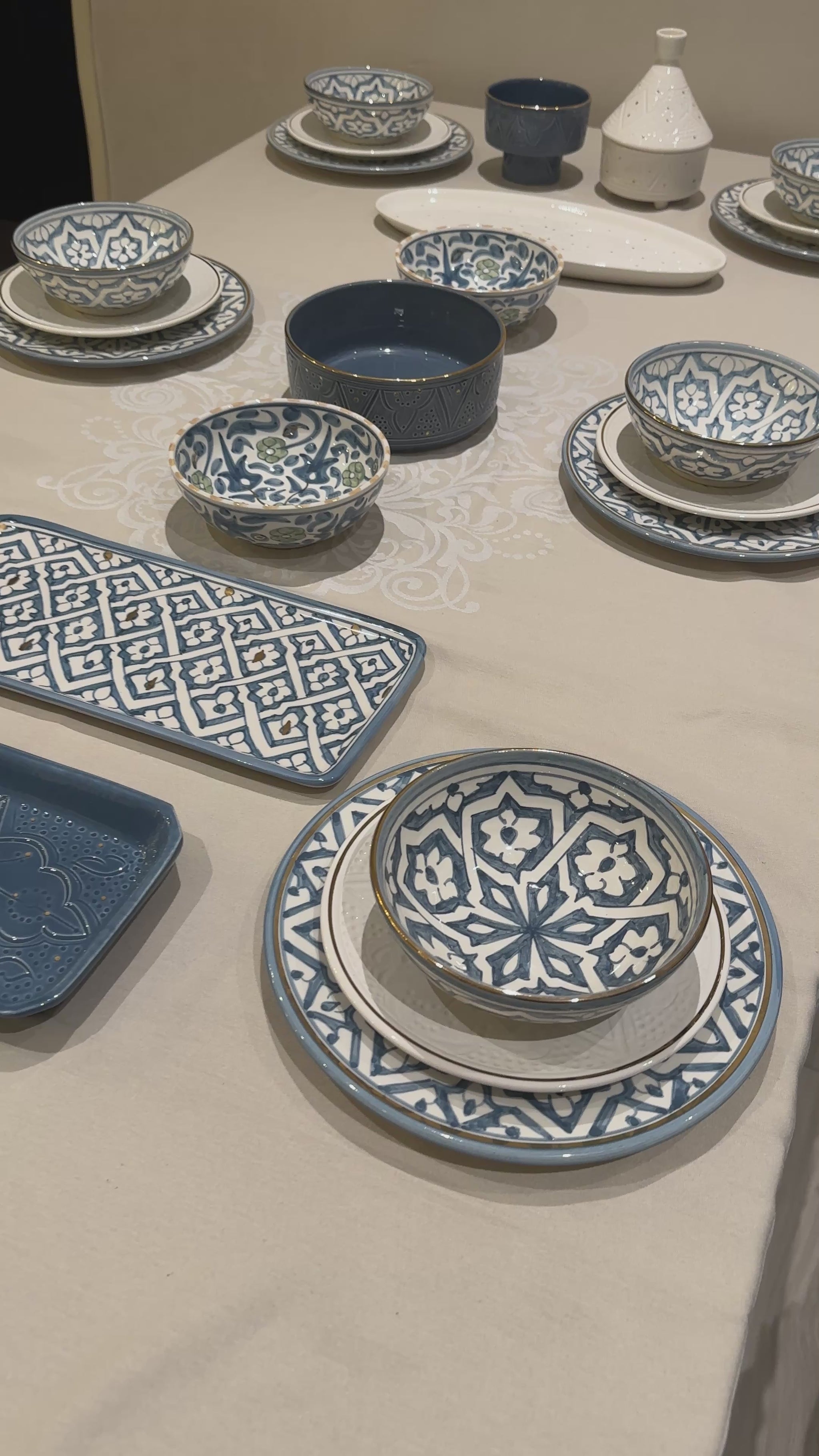 This 26-piece set, designed for 6 people, is hand-painted in a rich blue and crisp white palette. It is inspired by the intricate Moroccan zellige pattern, celebrated for its geometric beauty and timeless charm.