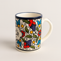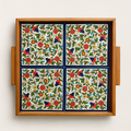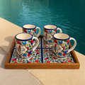 Bring a touch of Palestinian artistry to your table with this handmade tray and cups set. The tray is framed in natural wood and composed of four ceramic tiles. It is accompanied by 4 generously sized mugs.