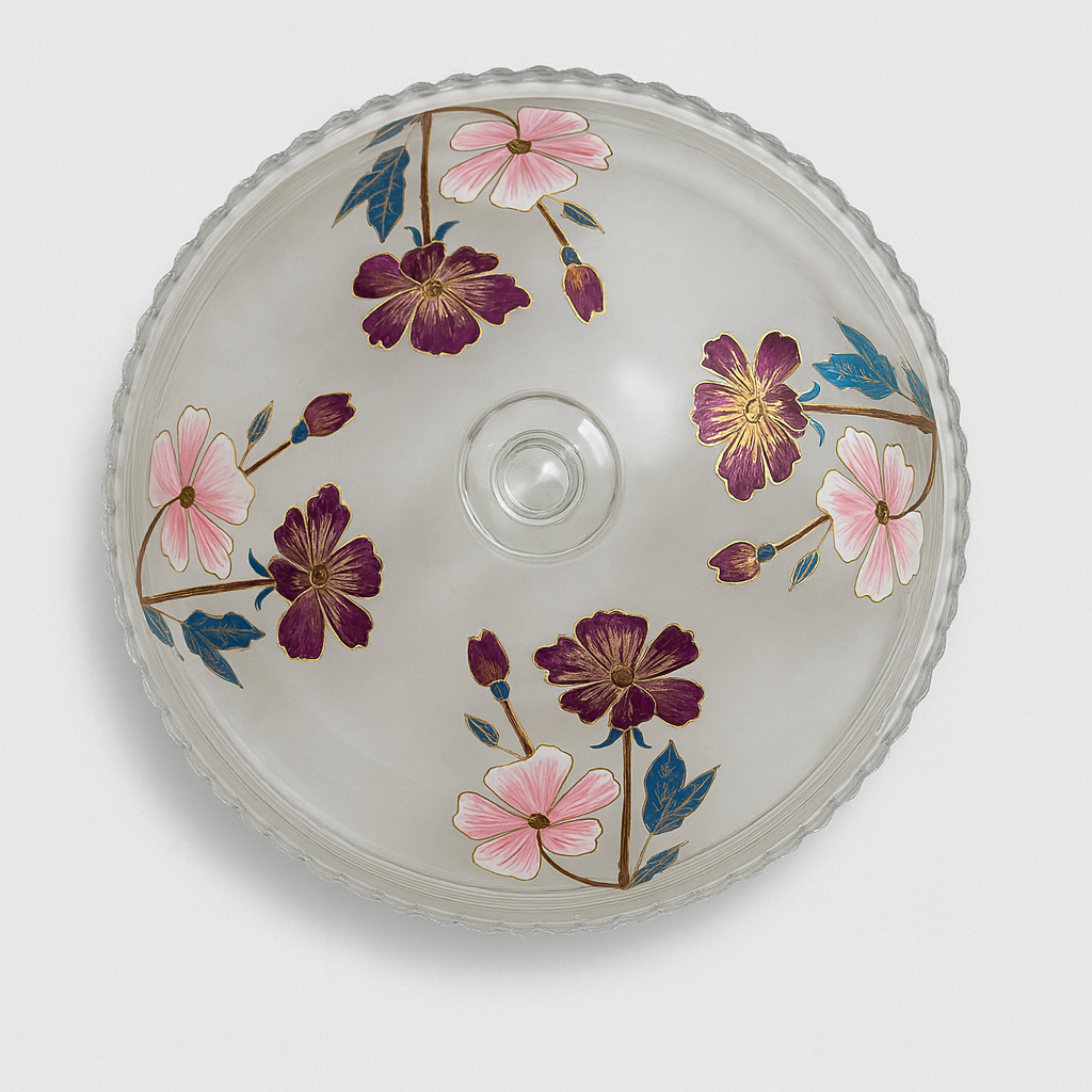 This glass serving plate with a lid is adorned with hand-painted floral motifs. It is ideal for serving or storing sweets, fruits, and desserts while keeping them fresh and well presented. It comes with a matching set of 6 Arabic coffee cups.