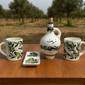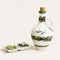 This handmade ceramic oil jug is inscribed with the word “زيت” in Arabic and beautifully decorated with a vibrant olive branch motif. It comes with a small 2-section plate for serving olive oil along with 2 matching mugs.