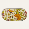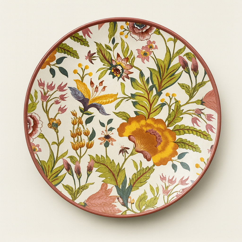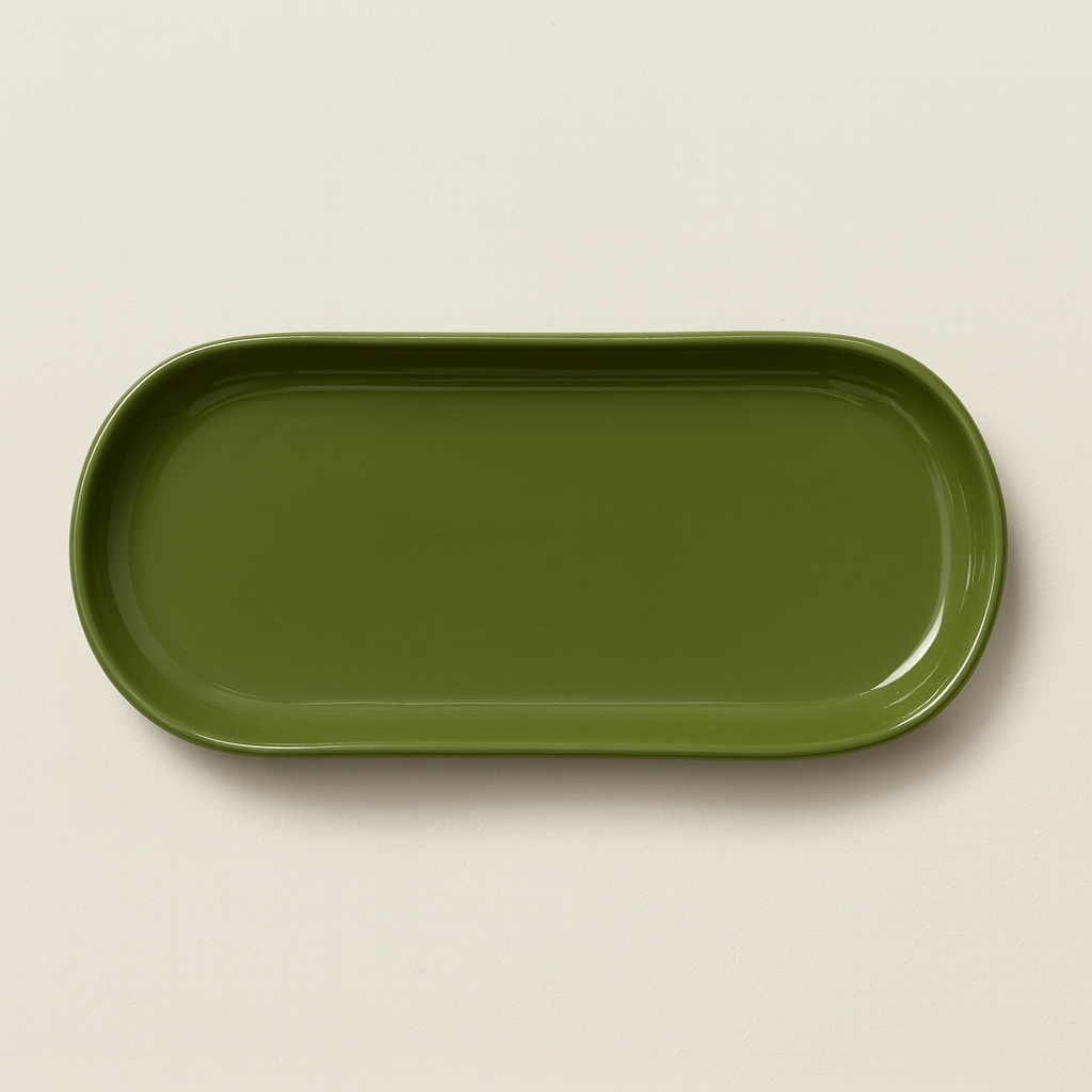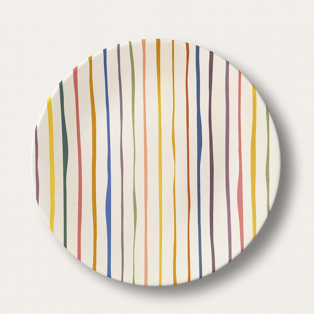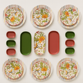 This colorful 21-piece set with striped and floral motifs includes six large dining plates and six small dessert plates. It also includes six small oval plates for olives, pickles, and sauces, along with matching oval plates intended for serving small bites and appetizers.